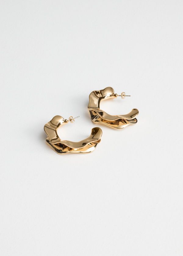 & Free ShippingBold yet elegant, these ripple hoop earrings feature a fluid, wave-like design in polished gold, adding a modern twist to the classic hoop.